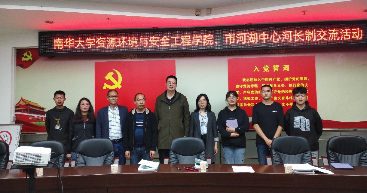 本次交流活动由环境科学与工程系房琦老师(左4)带领环境工程专业2019级五名学生前往衡阳市水利局河湖与水资源中心交流学习河长制。河湖中心支部委员黄湘武副主任(右5)、河湖与水资源室唐国良主任(右4)出席,针对衡阳市目前河长制的制度架构与河流现状分析等情况向师生进行了详细介绍与交流。