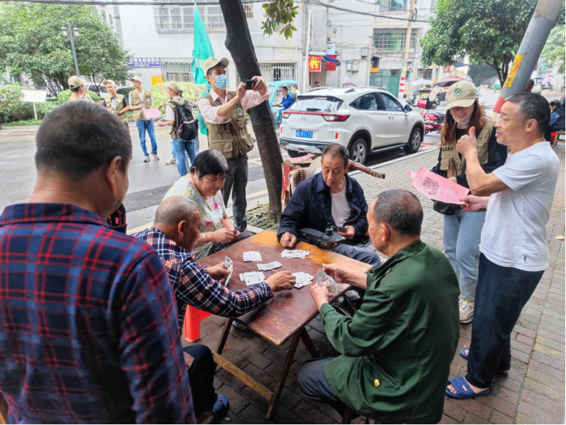 集体活动后,张晓文和唐东山带领衡阳绿雁大队成员进入和平小区,向市民散发“减塑限塑”宣传单并进行宣讲活动,进一步唤醒市民的环保意识。