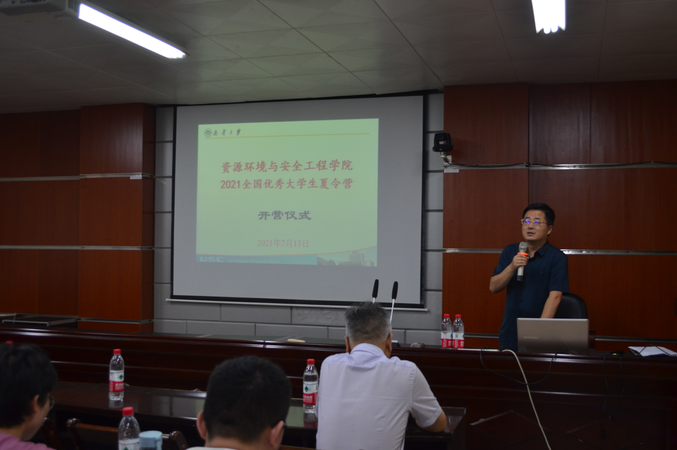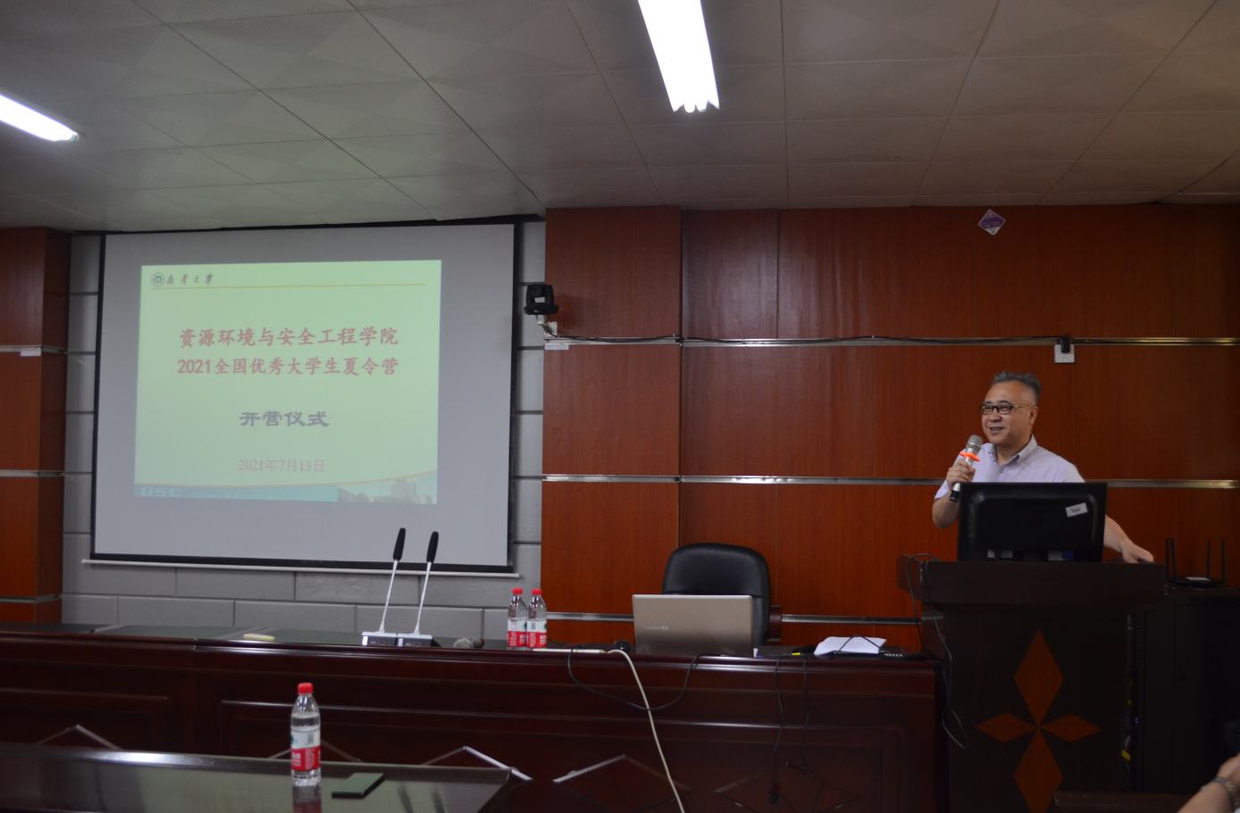 叶勇军副院长和李广悦院长分别在开营仪式上致辞,欢迎各位营员的到来,并介绍了学校的研究生招生政策,学院的学位点情况以及研究生教育的办学条件,同时希望通学生们通过本次夏令营更加深入全面地了解学院的办学特色,感悟学院的文化底蕴和学术氛围,期待同学们选择资环安学院,梦圆南华。