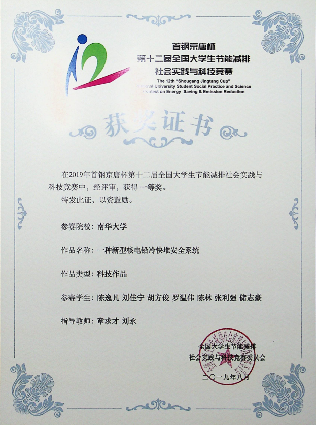 陈逸凡第十二届(2019)全国大学生节能减排社会实践与科技竞赛一等奖
