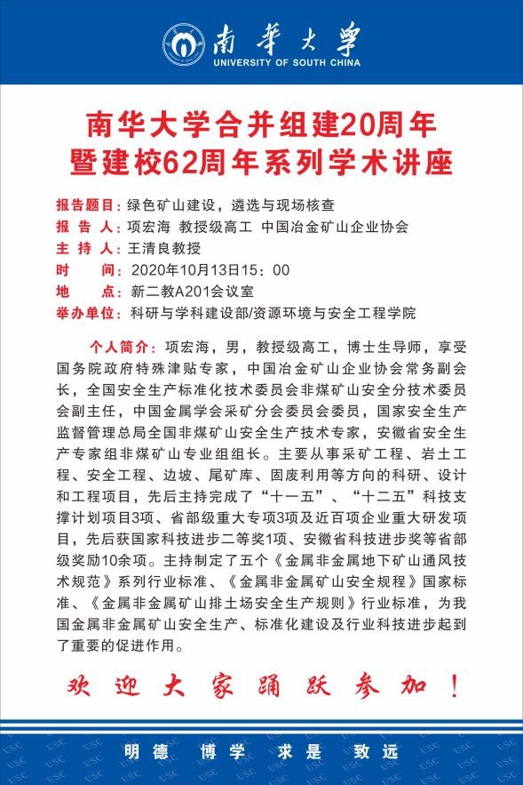 10月13日下午,中国冶金矿山企业协会常务副会长项宏海教授应邀在我院201会议室为师生进行了“绿色矿山建设、遴选与现场核查”学术讲座;此次讲座为我校合并组建20周年暨建校62周年系列高水平学术报告。报告会由王清良副院长主持,项宏海教授向师生详细介绍了国内外绿色矿山建设的实践与发展,并提出在绿色矿山建设中能开展的研究领域。