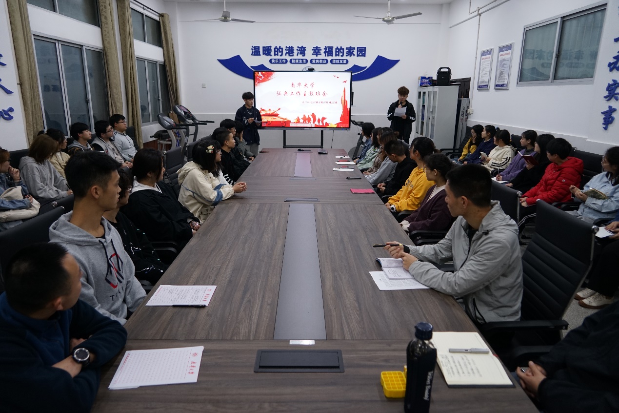首先是叶坚老师宣讲征兵政策。叶老师从如何应征入伍和入伍后相关激励政策两个方面进行宣传。应征入伍有两种方式,一种是一般入伍流程,年满18周岁在校大学生通过全国征兵网进行兵役登记,然后进行初步检查,再通过体检政检、走访调查、预定新兵、张榜公示最后批准入伍。另一种是士官直招,通过一般入伍流程报名,但是只招毕业大学生。其中需要注意男性年龄不能超过24岁,女性则不能超过22岁,视力不能低于4.5,男性身高不低于160cm,女性身高不低于158cm,男性体重不超过标准体重的30%不低于15%,女性不超过20%不低于15%。叶老师还讲到了激励政策:退役大学生复学可跳转专业不受限制,体育课成绩评定为优秀,大学学杂费全免,考研降分等,并举出许多优秀参军大学生,用他们的例子来激励同学们踊跃参军。