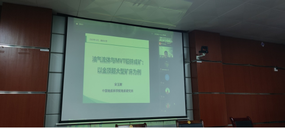 报告中,宋玉财研究员从自然界铅锌的重要来源——密西西比河谷型(MVT)矿床出发,阐释了MVT矿床常与油气藏空间关系密切的特点,解读了针对油气流体与MVT矿床铅锌成矿的不同观点,并以我国滇西金顶矿床为例,从空间、时间、成因三个角度详细分析了油气流体与MVT矿床铅锌成矿之间的关系,为有机质指示铅锌等金属矿床的找矿勘探指明了方向。最后,宋玉财研究员与参会师生们进行了热烈地交流讨论,将整场会议推向了高潮。宋玉财研究员的报告深刻而独到,在师生之间引起了强烈反响。大家纷纷表示,此次报告开拓了自己的思维,为今后的研究工作提供了全新的启示与帮助。