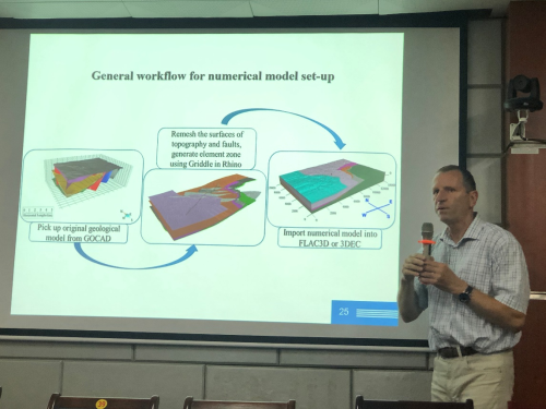 报告会上Heinz Konietzky教授首先介绍了矿山开采完成后,预测岩石长期力学行为的必要性。他指出岩石的长期力学行为大多采用数值模拟来进行预测,预测精度是关键,需要结合现场监测数据、室内试验并考虑岩石的多场耦合特征、应力-应变-时间本构模型及破坏准则。同时,Heinz Konietzky教授给大家分享了近年来在所在团队在岩石的长期力学行为预测方面做的几个案例。报告会上,Heinz Konietzky教授与在座的师生进行了热烈的讨论,并结合我院特色,分析了世界各国在高放废物深地处置库的场址选择和建设要求,并对处置库的多场耦合特征和长期稳定性的预测提出了建议,他表示双方可以在这一方面进一步加强合作与交流。